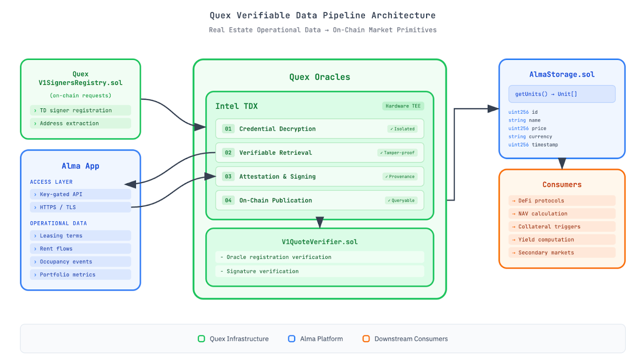 That thesis is exactly what alma (proptech operating platform) and Quex (verifiable computing / oracle infrastructure) have been working to address: building a cryptographically verifiable bridge between off-chain operational data and on-chain consumption.